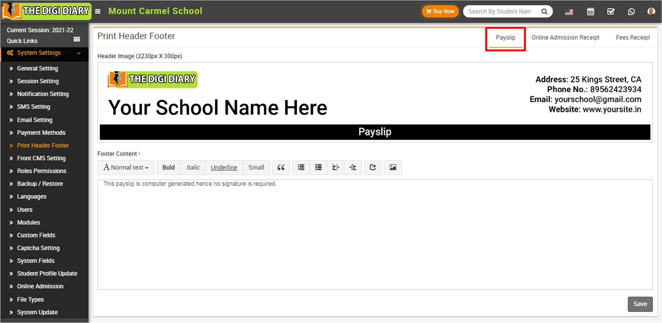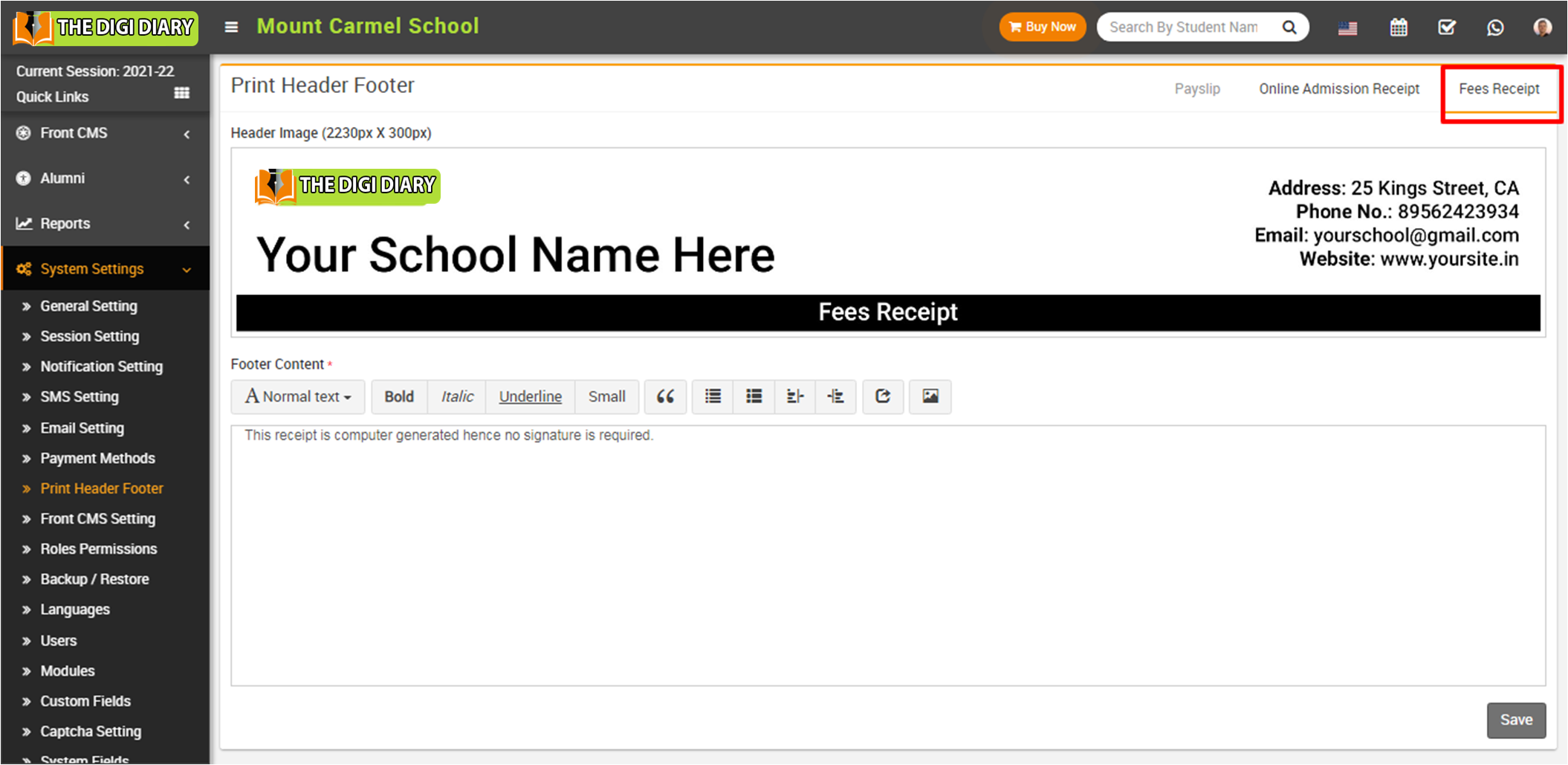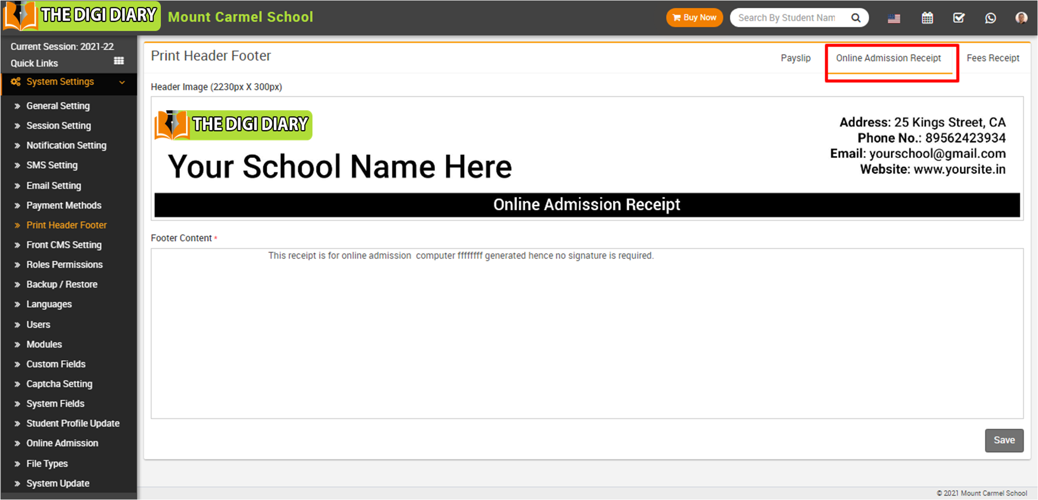 To add print header footer Online Admission Receipt (for student) click on Online Admission Receipt present at top right corner in the print header footer page. Here you can replace your header image select Header Image and enter Footer Content and then click on Save button.