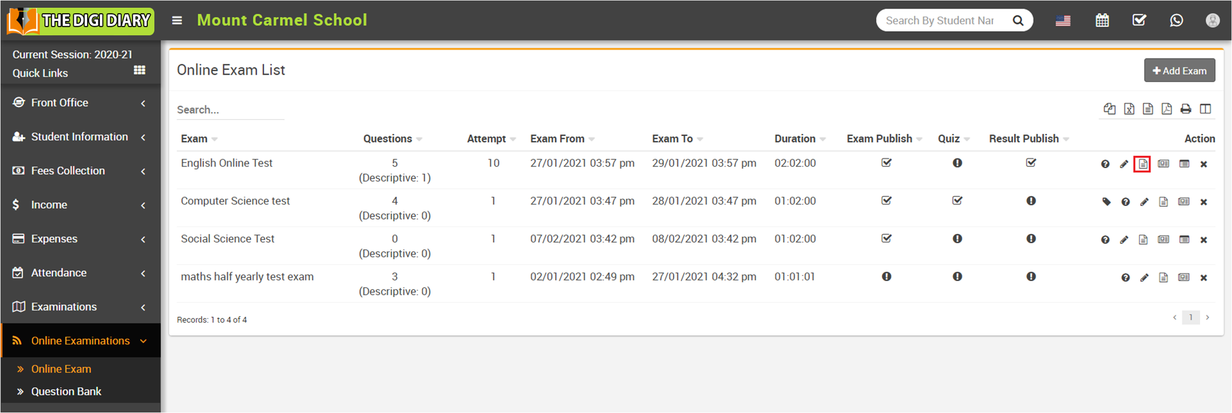 To view question list of perticular exam, click on the File-Text icon, this will show you all the question list related to the exam.