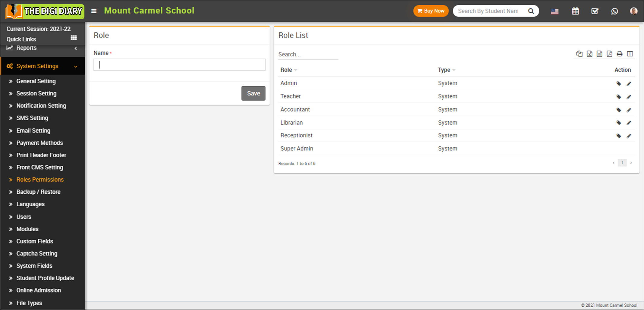 To add roles, go to System Settings > Roles Permission then enter role Name and then click on Save button. You can view this added record in the Role List on the right side of the page.