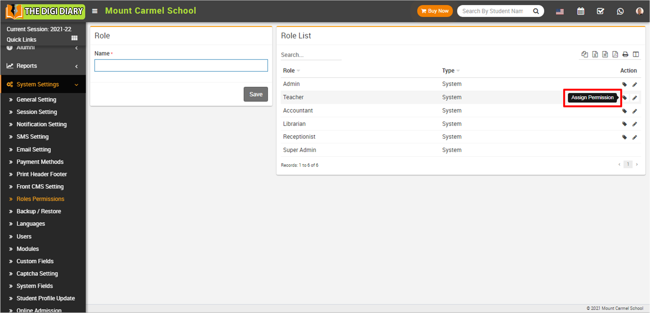 To assign permission click on Assign Permission icon present in role list, at click of this icon Assign Permission page will be open, Here you can assign permission for each module and then click on Save button.