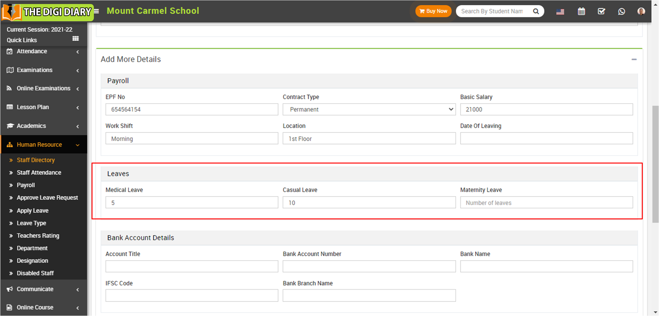 Note - Before apply for leave make sure you have assigned leave to staff from Human Resource > Staff Directory > Edit Staff at Leaves section otherwsie on Leave Type drop down no record will be shown.