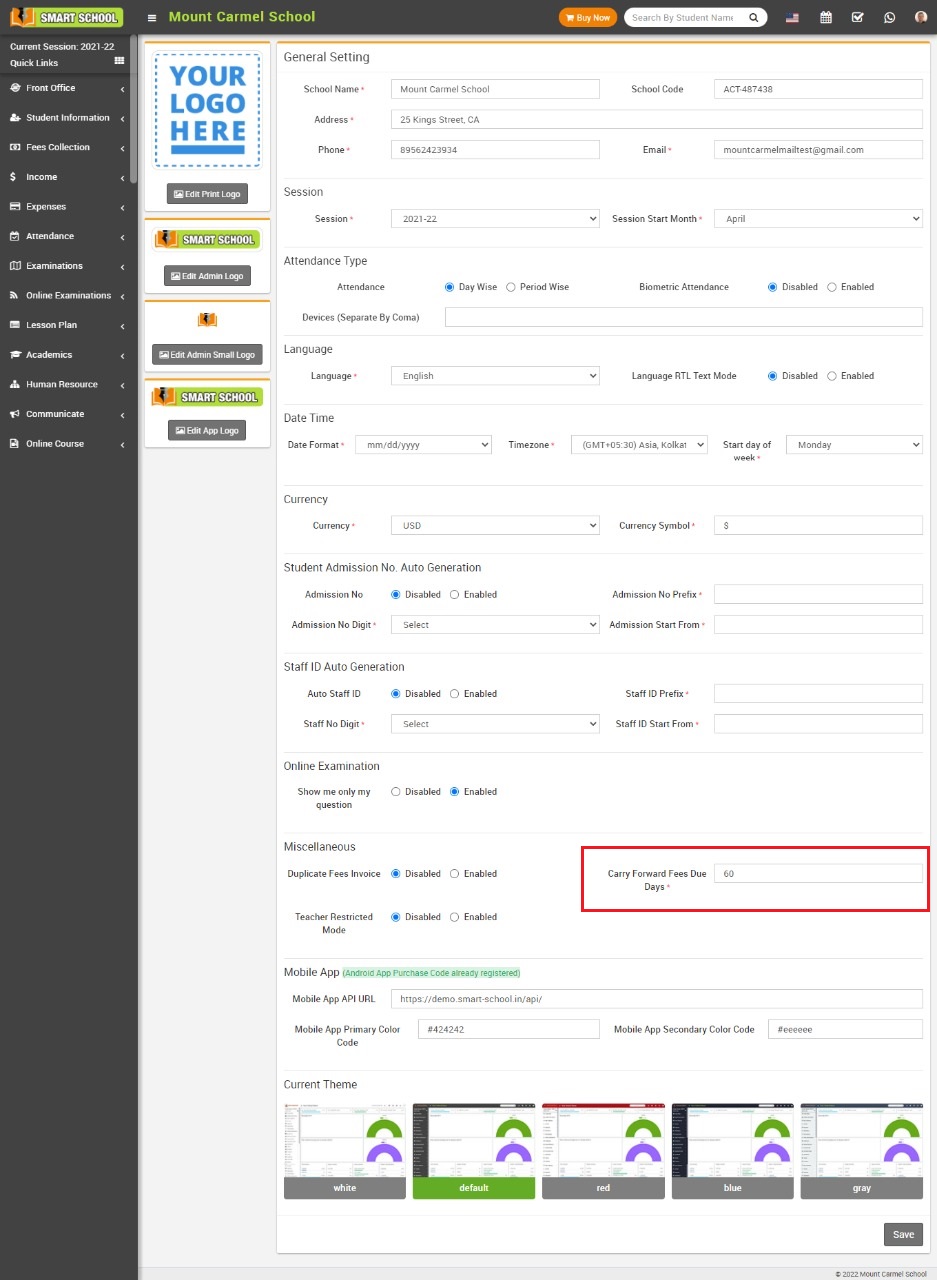 To set carry forward due date, go to System Settings > General Setting then go to Miscellaneous section and then enter Carry Forward Fees Due Days and then click on the Save button. the number of days which you enter here due date will be exceed from current date.