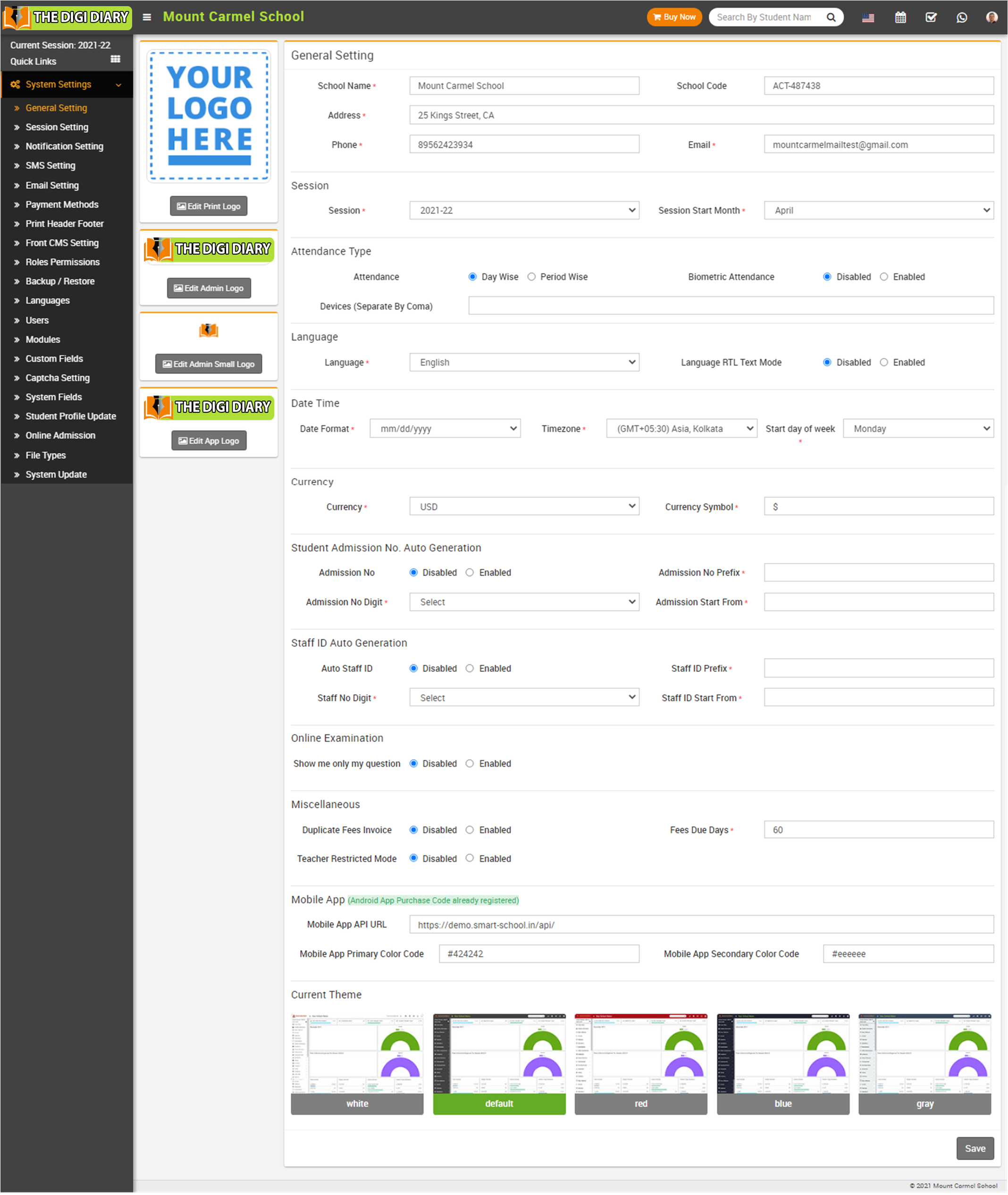 Apart from logos here you can update your School Name, School Code (Is your affiliation and accreditation no), Address, Phone, Email, Session (current running academic session for the school), Session Start Month, Attendance Type - Day Wise & Period Wise, Biometric Attendance - Disabled & Enabled, Devices (Separate By Coma), Language- Language (in which you want to run your The Digi Diary), Language RTL Text Mode (for Arabian side languages), Date Time – Date Format, Timezone, Start Day of Week, Currency – Currency (ISO Standard 3 digit code), Currency Symbol, Student Admission No, Auto Generation – Admission No (Disable/Enable), Admission No Prefix, Admission No Digit, Admission Start From, Staff ID Auto Generation – Auto Staff ID, Staff ID Prefix, Staff No. Digit, Staff ID Start From, Online Examination -Show me only my question (Enable/Disable ), Miscellaneous – Duplicate Fees Invoice (Disable/ Enable), Fees Due Days (Used in Fees Carry Forward), Online Admission (Disable/ Enable), Teacher Restricted Mode (Disable/ Enable), Mobile App – Mobile App API URL, Mobile App Primary Color Code, Mobile App Secondary Color Code, Current Theme and then click on Save button.