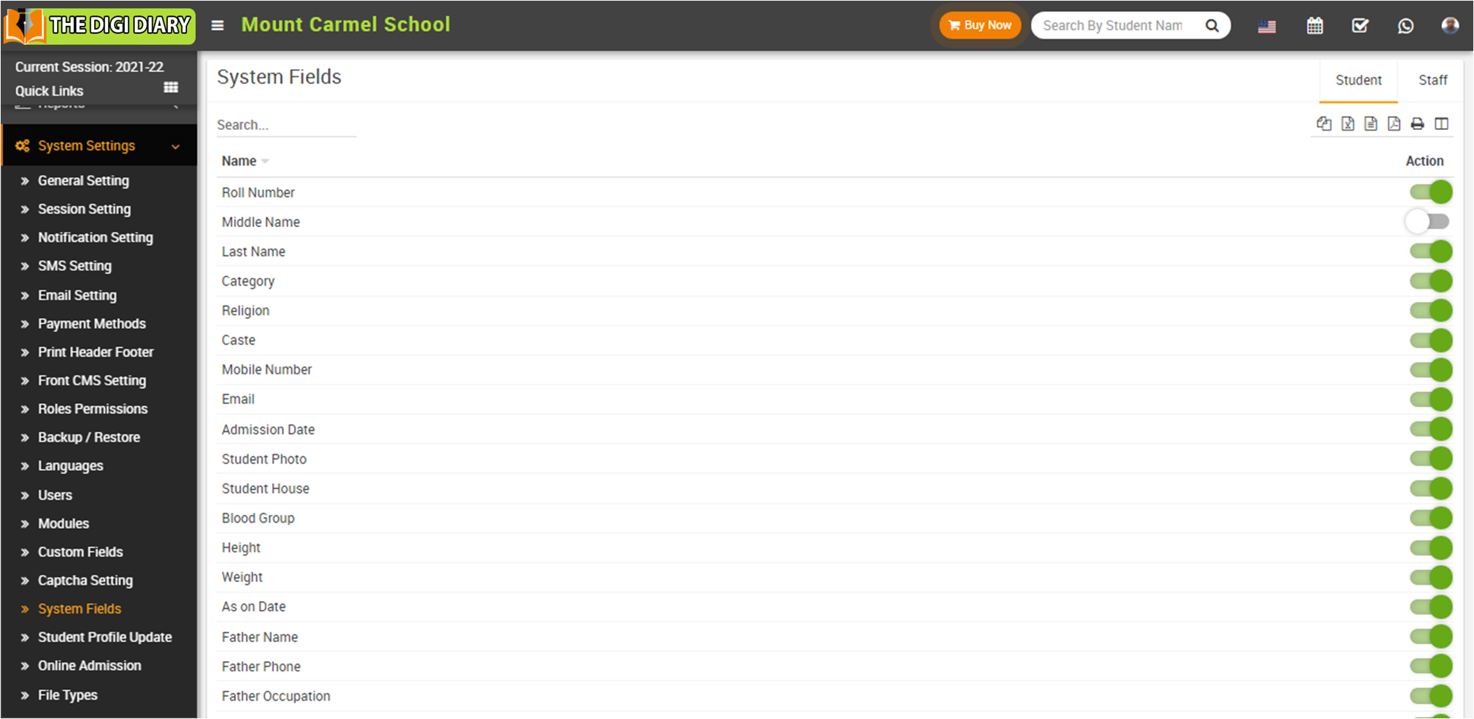 To disable system field, go to System Settings > System Field. Here you can see all enabled field. You can enable/disable any system field in student and staff.