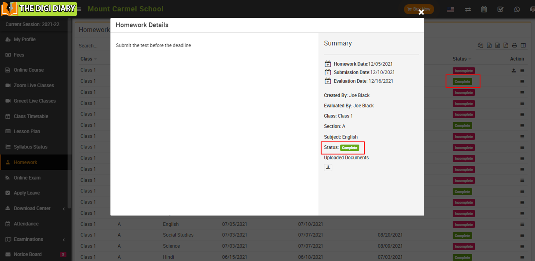 After review Student's submitted homework assignment teacher can evaluate homework so it will marked as complete at student account.