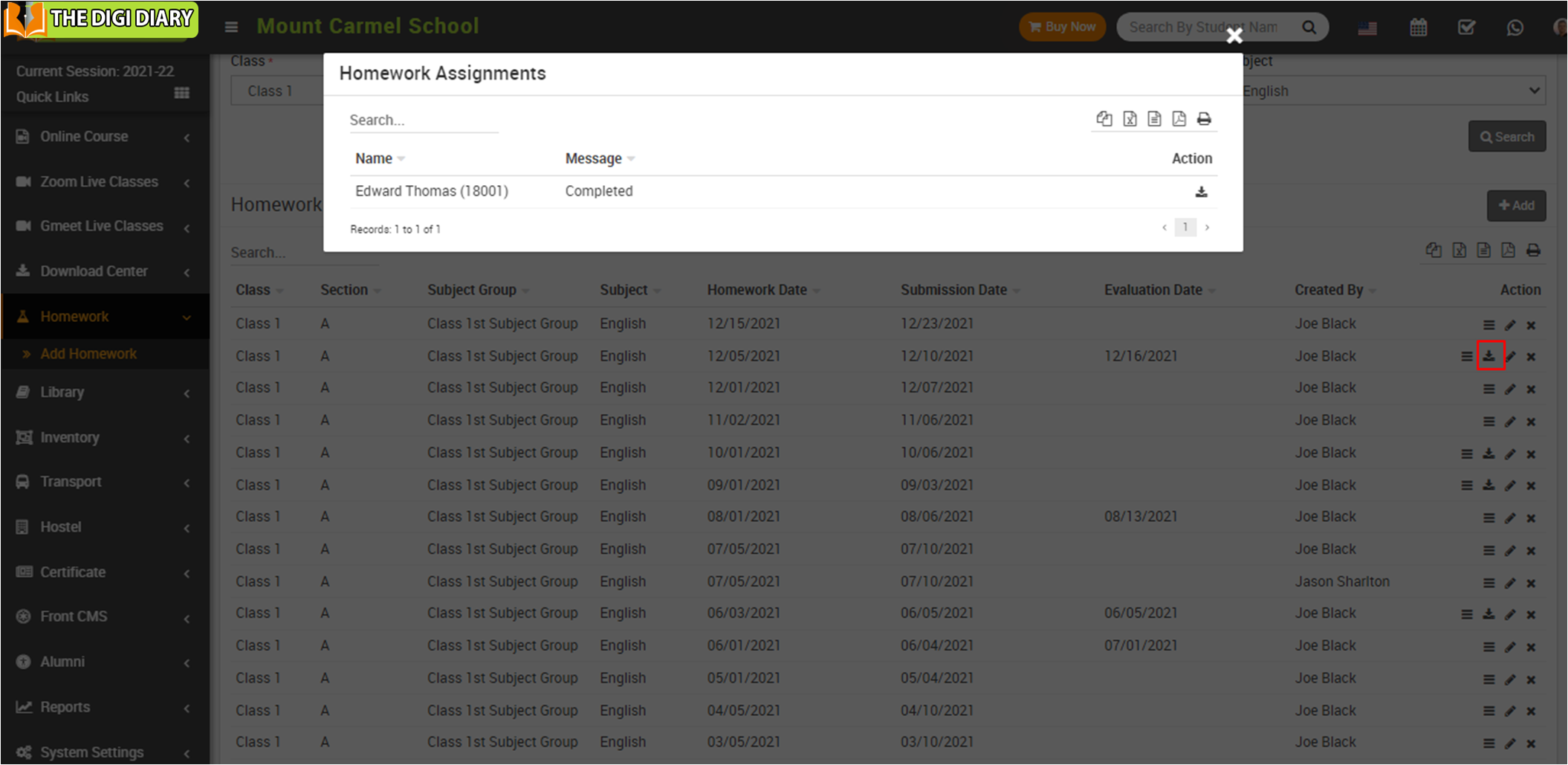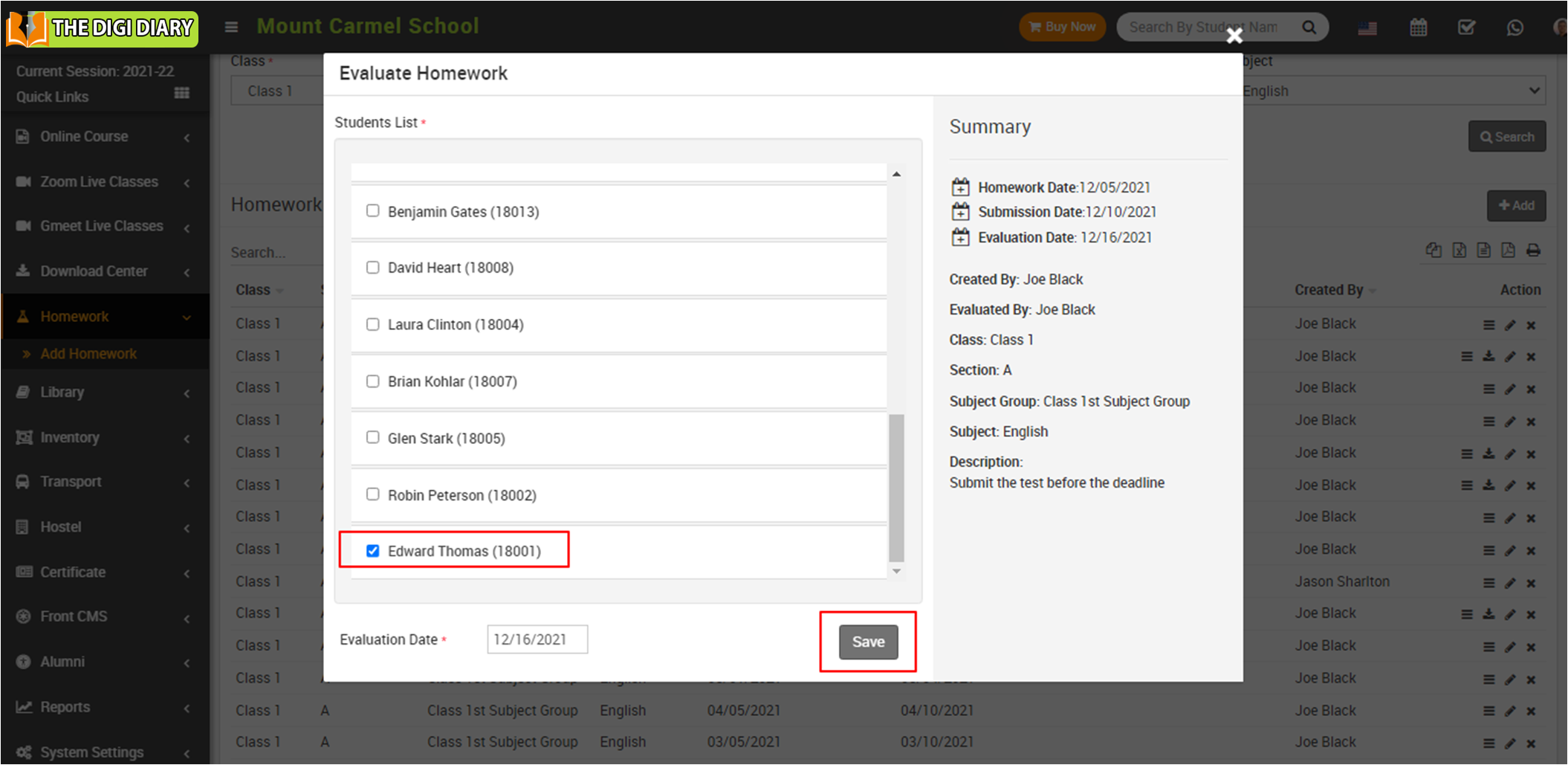 To view evaluate homework click on the View icon present at Action column in the homework list, at click of this icon evaluate homework model will open, here from the Student List section, select student who has completed this homework and then select Evaluation Date then click on the Save button.
