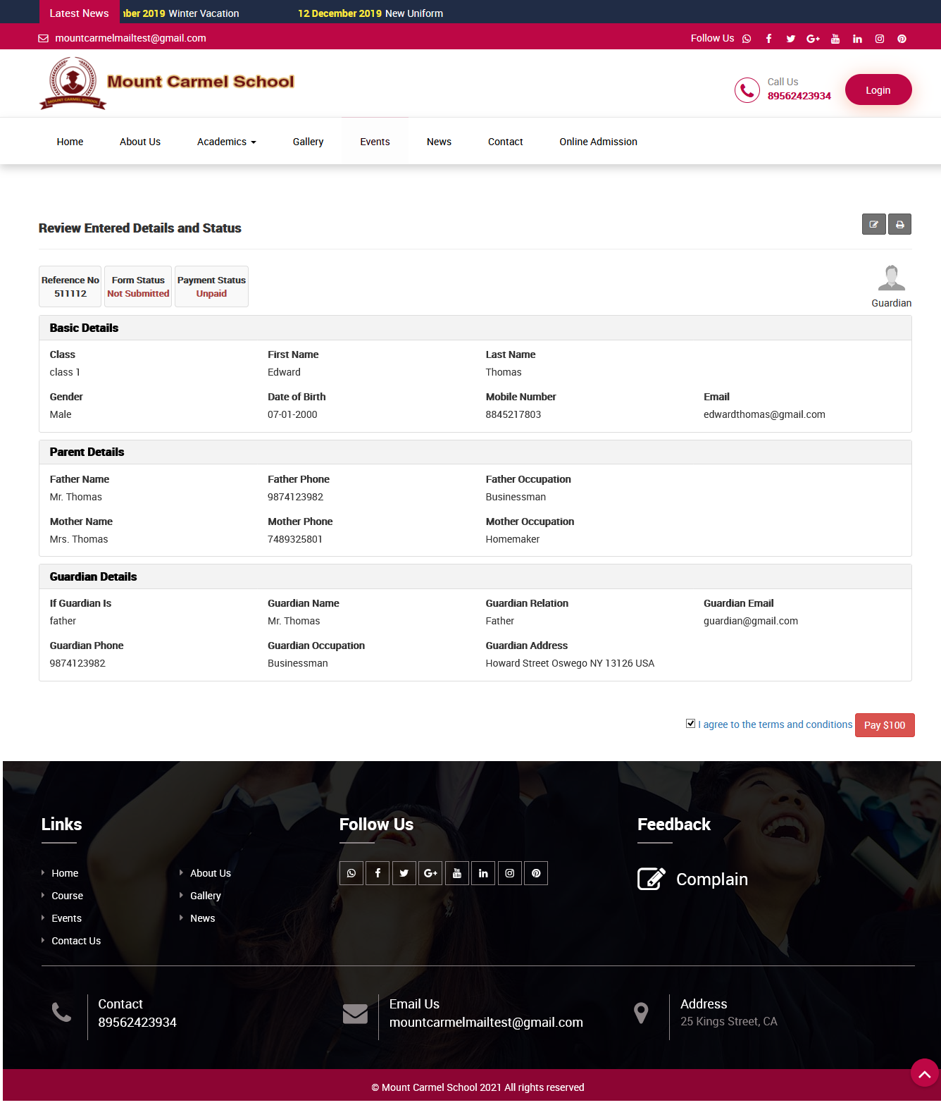 After submitting form, this will redirect you in Online Admission Review Details page where you can check your details what you have filled previously.