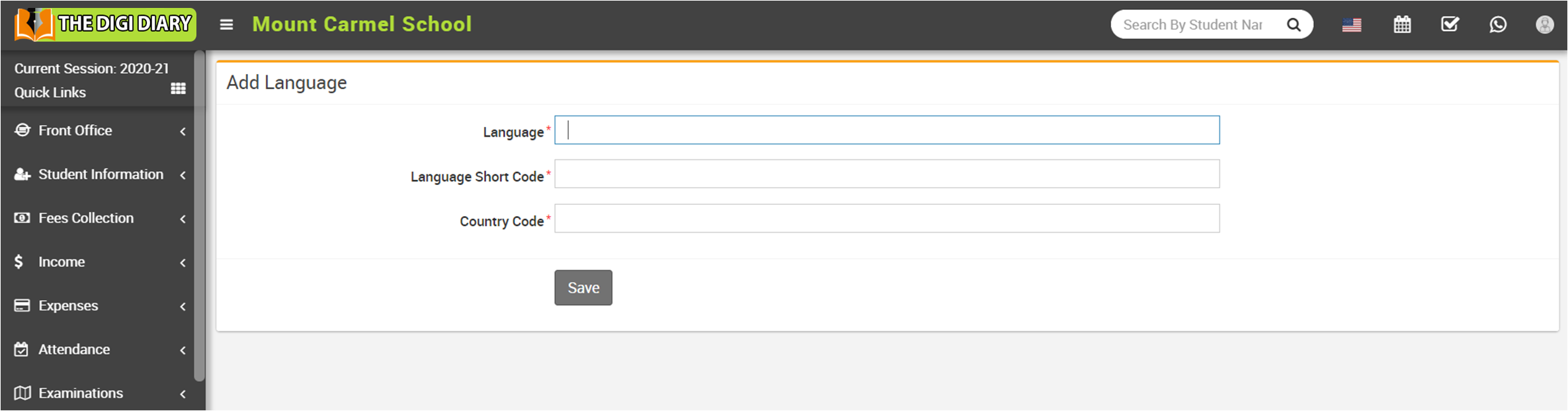 To add language, go to System Settings > Languages then click on Add button present at top right corner on the language list page, at click of this button Add Language modal will be open. Here enter Language, Language Short Code, Country Code and then click on Save button.