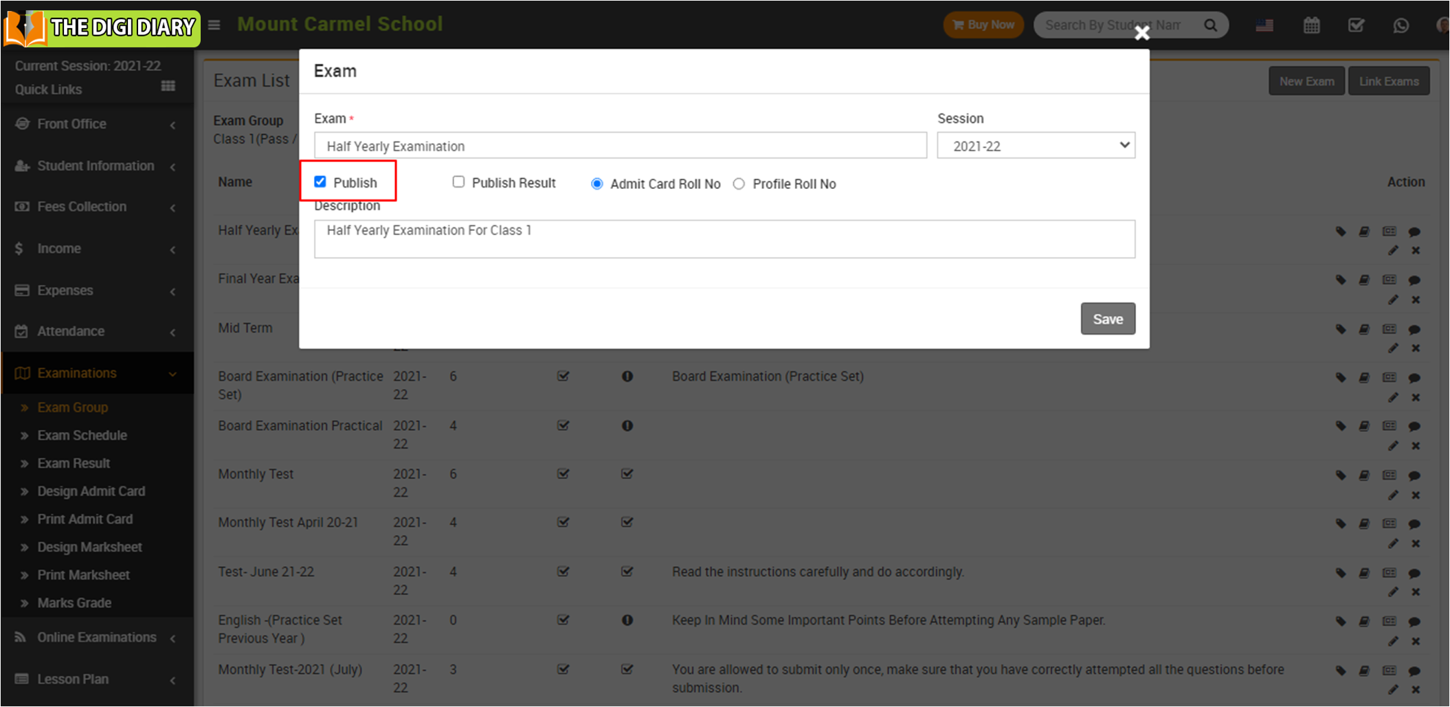 In The Digi Diary Examination when you create exam then you will get option for publish exam (check attached screenshot) so if you enable this option and save it then your exam will be publish and student will be able to attend this published exam, also if you have enabled publish exam status then the Status value in the exam list page will be show with check mark.
