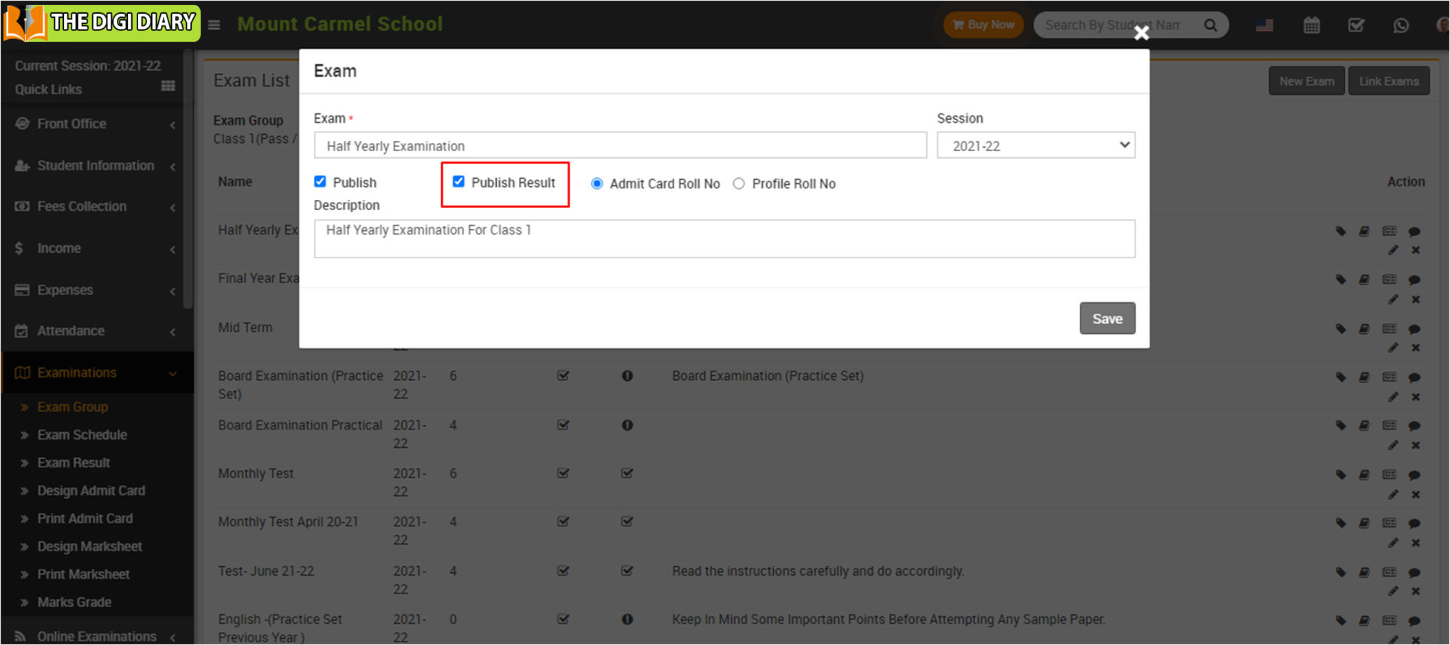To publish Examination result after enter students exam marks you should click on edit exam button and here enable Publish Result option and then save it so your created exam result will be published and visible to students at Exam Result page.