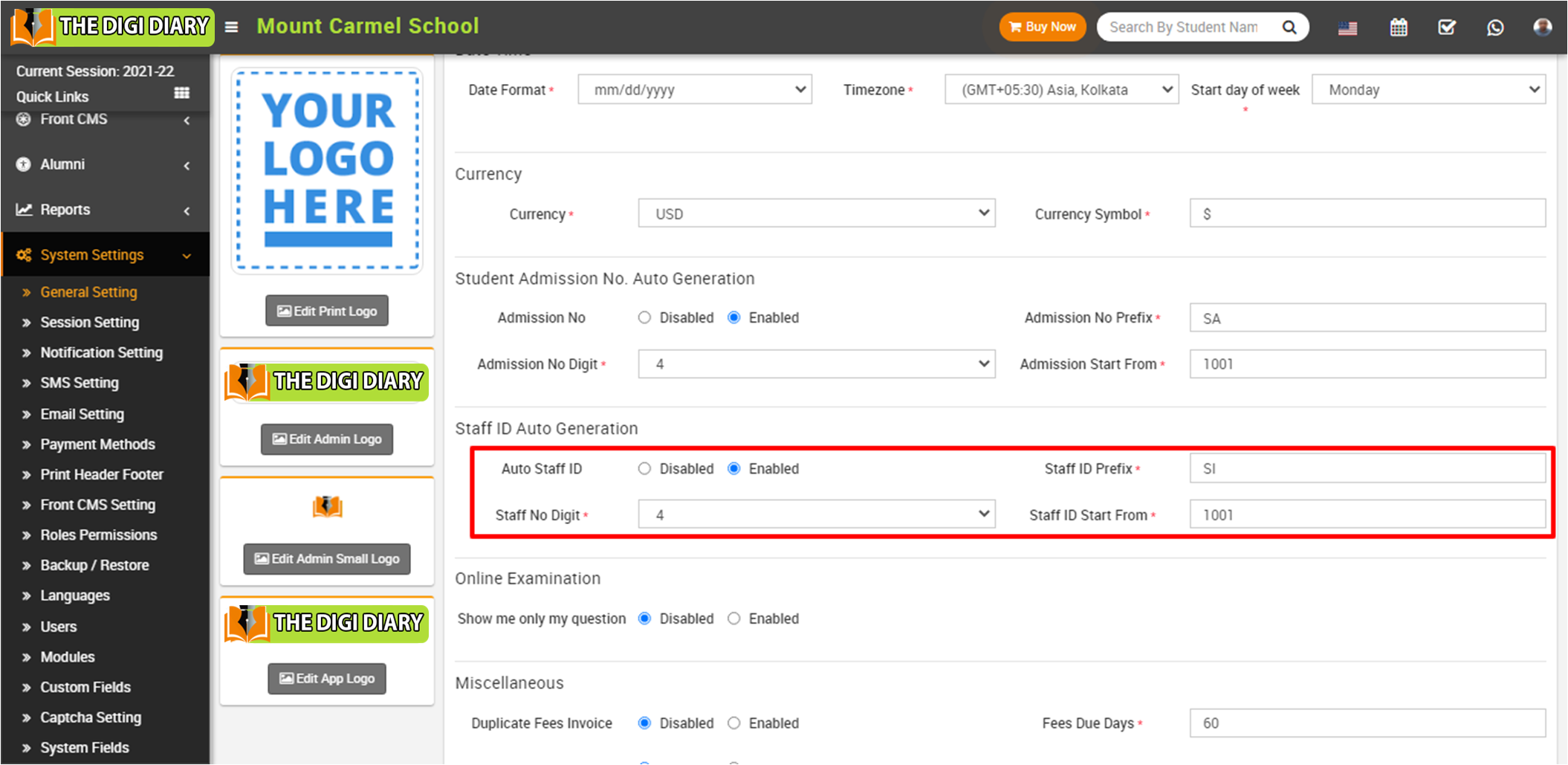 To set values for Staff ID No. Auto Generation here it is recommend to set prefix any alphabet character like SI and if you select Staff ID No Digit as 4 so you must set ID Start From value of 4 digit like 1000 or 1001 otherwise it will show error. Also make sure auto generated Staff ID no. will not conflict in future with any existing Staff ID no. (with manually entered Staff ID No. value).