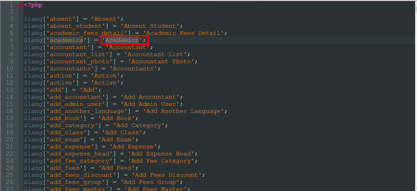 For e.g. if you want to change text lebel of "Academics" to "Academics Settings" in English language then go to the file path location \application\language\English\app_files and open system_lang.php file then serach for the keyword "Academics"