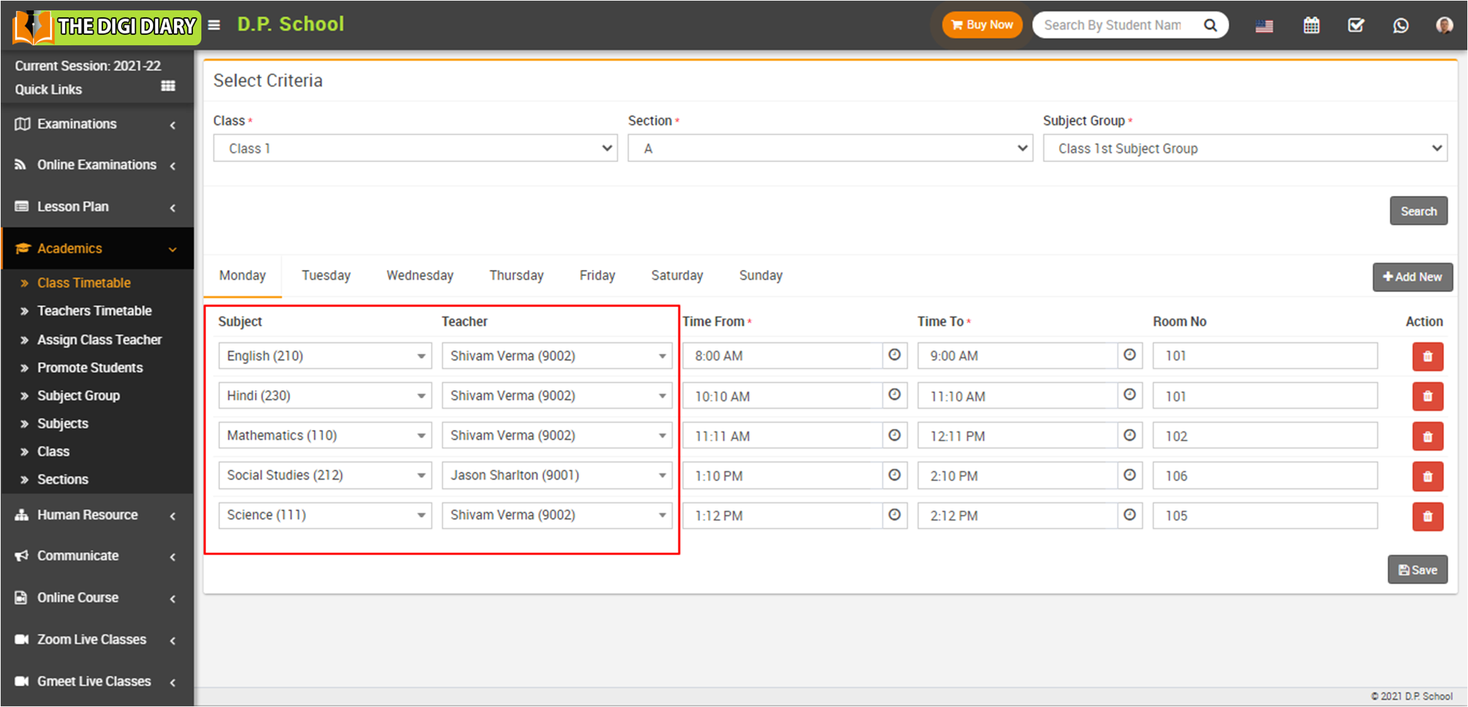 To assign Subject Teacher you need to create Timetable from Academics > Class Timetable for the class and from here you can choose subject and can assign teacher to those selected subjects.